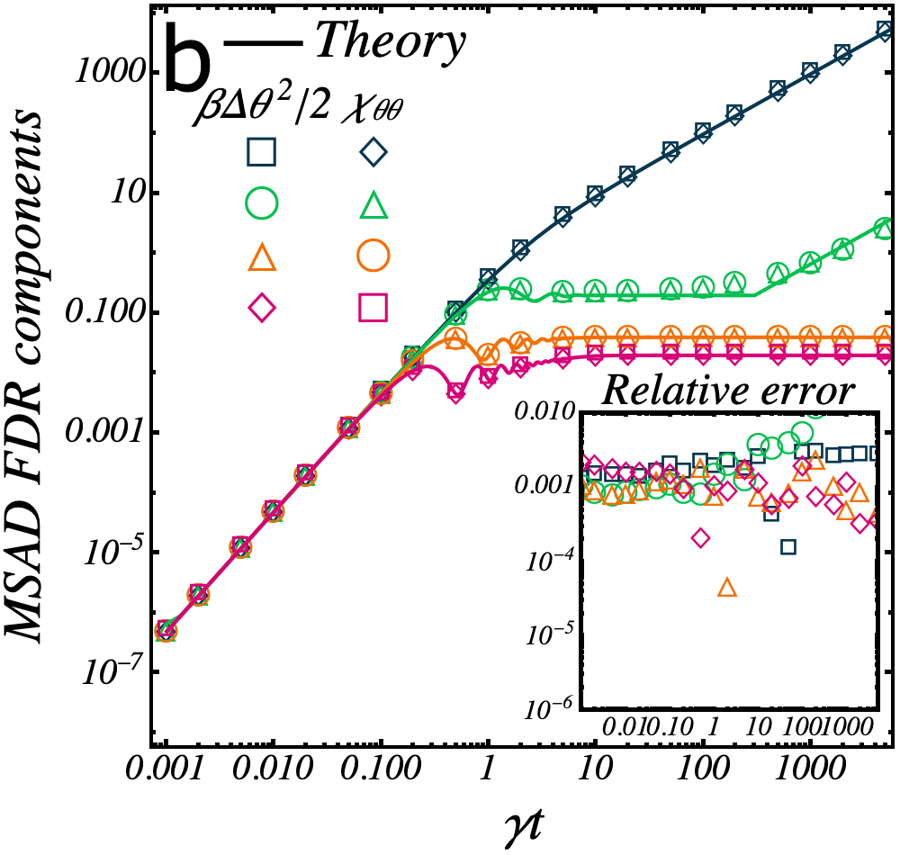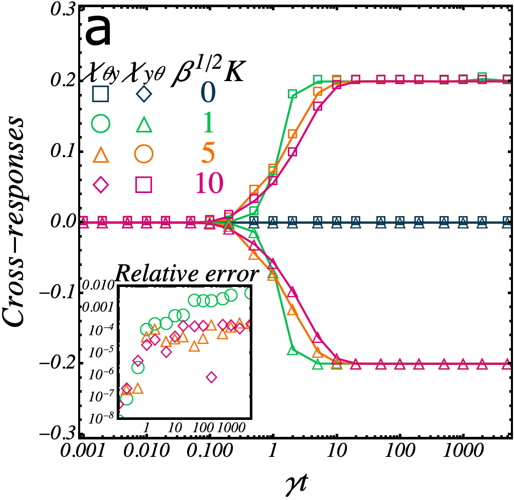 Finally, I studied the time reversal properties of the system. Using a path-integral representation of the dynamics, I established that the system obeys a generalized time-reversal symmetry under which spins are flipped, and proved the corresponding Fluctuation-Dissipation Theorem. In a few words, the usual relations are obeyed, provided that one writes the theorem in the co-moving frame with the velocity of the tachostat. The oddness of the spin under the right time reversal operation has a direct consequence: the response of the position to torques acting on the spin and the response of spins to forces acting on the position violate the usual Onsager reciprocity relations and are instead linked by Onsager-Casimir reciprocal relations, usually reserved to charged particles in magnetic fields.